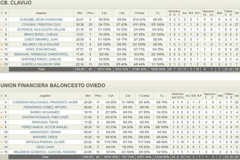 IGUALDAD AL DESCANSO El partido parecía cambiar su ritmo en un segundo cuarto donde el equipo dirigido por Jenaro Díaz se mostraba más fluido y acertado de cara al aro. Un excelente pick and roll de Juan Cabot provocó el tiempo muerto de un Carles Marco al que no le estaban gustando las cosas. A falta de 6,14, 24-25 para el conjunto asturiano. Las numerosas pérdidas de balón del Unión Financiera Baloncesto Oviedo provocaron que el CB Clavijo se pusiese por delante en el marcador. Los riojanos estaban marcando el ritmo a seguir y su juego interior hacía daño a la defensa asturiana. Víctor Pérez y Fabio Santana tomaban las riendas del ataque ovetense y permitían a los suyos seguir por delante. A falta de 2,15, 33-34. Al descanso, anotación baja por parte de los dos equipos e igualdad máxima, 38-38.
