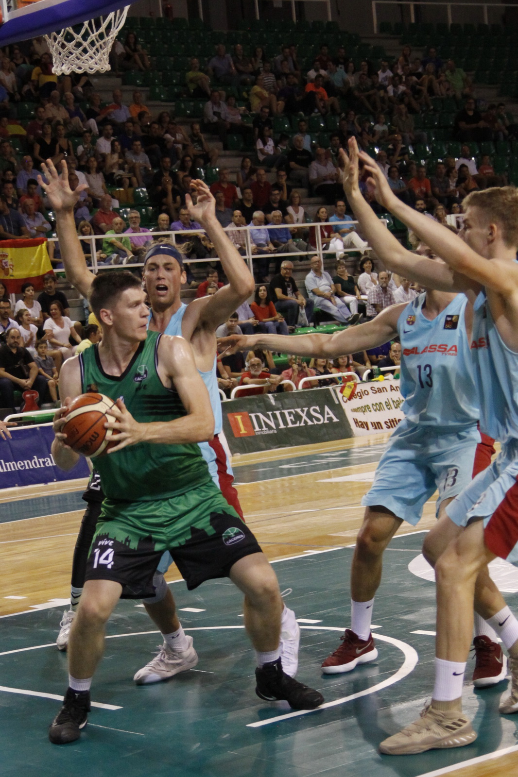 ACIERTO EXTERIOR El acierto en el tiro exterior de los locales se mostraba clave en el inicio del partido. 14 a 6 en poco más de cinco minutos de juego y cuatro triples de los locales, hacían coger ventaja a los locales. El azulgranas no veían la canasta con facilidad y finalizaban el primer cuarto 9 puntos por debajo (23-14). Cáceres acabaría el encuentro con 17/32 en triples, destacando Warren (5/10) y Rakocevic (4/7).