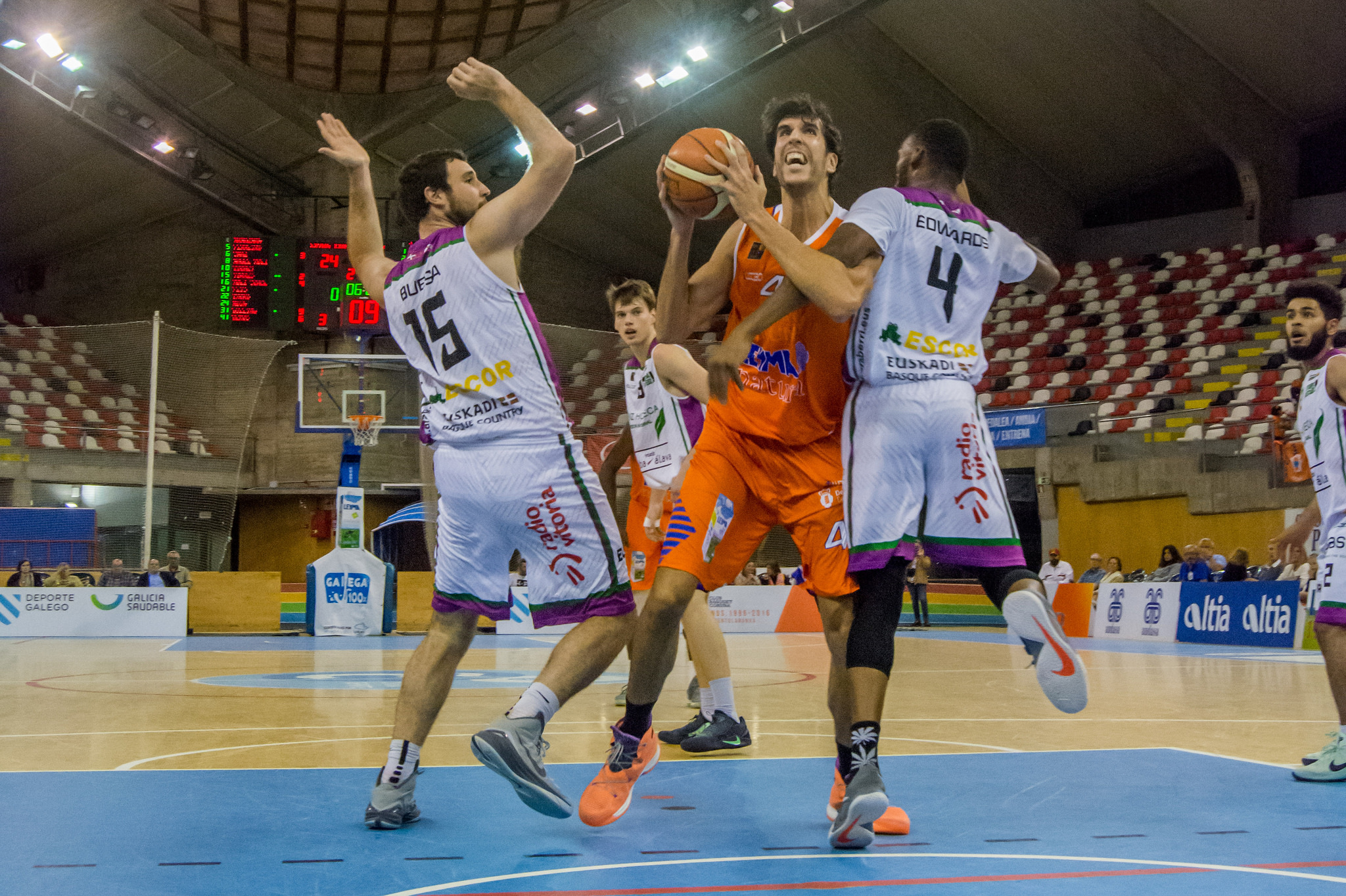 ARABERRI PLANTA CARA. El tercer cuarto empezó con una canasta a tablero de Sonseca pero pronto se vio que Araberri no iba a bajar los brazos. El equipo de Antonio Pérez Caínzos aumentó su nivel de agresividad en defensa para contrarrestar el poderío interior de los locales. Así, cuando el pívot coruñés recibía en el poste bajo dos y hasta tres jugadores saltaban sobre él para impedir sus evoluciones. En esta tarea sucia destacó un fortísimo Kedar Edwards que se convirtió en un inexpugnable bastión defensivo. Anulados los cincos del Leyma que tampoco encontraba el acierto desde el perímetro (mención especial para un improductivo Cooney) los alaveses consiguieron recortar distancias (51-49 a falta de un minuto) guiados por un magistral Johnny Dee, que anotó 12 puntos en este parcial. Una canasta de Chuku al límite del tiempo colocó el 55-51 en el marcador a falta sólo de diez minutos.