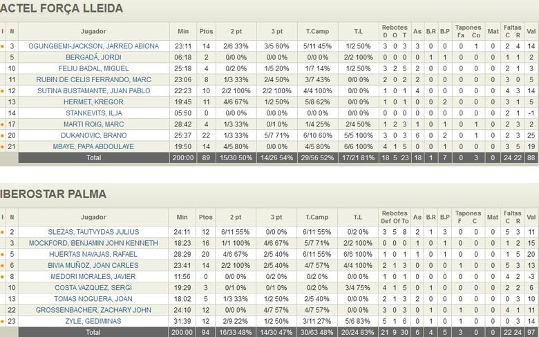 EL MVP: Brano Dukanovic, 22 puntos y 3 rebotes para 25 de valoración. A falta de Tim Derksen, el serbio llevó la presión anotadora exterior del Lleida con acierto. Bien es cierto que sus 5/7 en triples son casi en su totalidad liberados a causa de un mix entre la floja defensa palmesana y el “pase extra” catalán, aunque luego hay que meterlos, un 71% de acierto, brutal. Por parte de Palma apareció Rafa Huertas, tuvo su día en el tiro a media distancia y cuando a su equipo le quemaba la pelota cogió la responsabilidad para las entradas a canastas y paro a media distancia, para conseguir un total de 20 puntos y otros tantos de valoración.