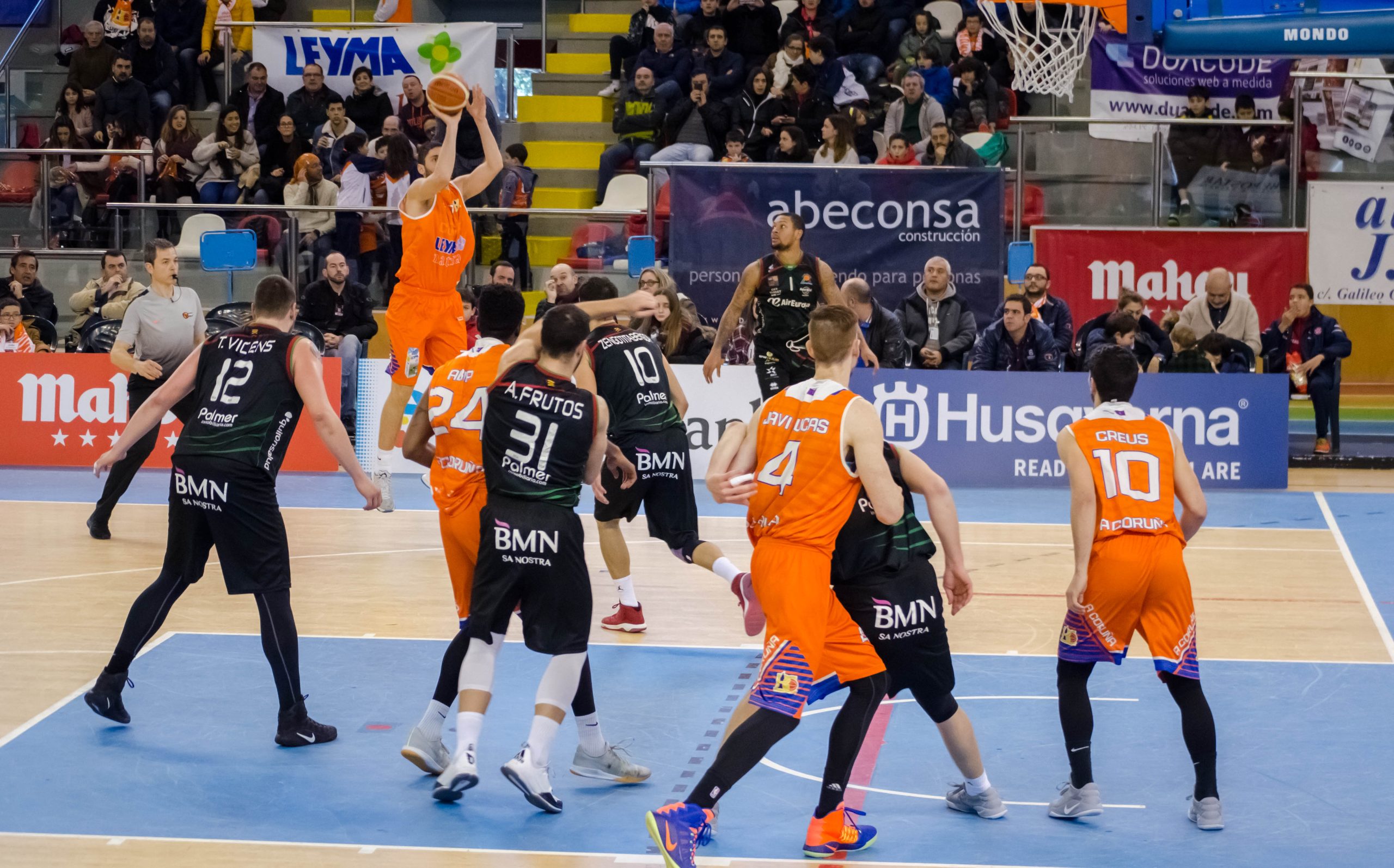 NO HAY PARTIDO… HAY PARTIDO. El inexperto Pablo Ferreiro saltó al parqué cuando aún no se habían consumido 16 minutos de juego, circunstancia poco habitual en el equipo de Tito Díaz. Parecía un buen momento para que el joven base lucense sumase minutos y experiencia a su currículum. Sin embargo, la presencia en pista del jugador formado en el Estudiantes de Lugo coincidió con el resurgir del Palma Air Europa. La alternancia de defensas zonales (1-3-1 primero, 2-3 después) dispuesta por Xavi Sastre cortó el ritmo de un Leyma que empezó a errar lanzamientos cómodos, uno detrás de otro, de manera inexplicable, producto quizá de la relajación. Daba la sensación de que los coruñeses estaban disputando ya los minutos de la basura mientras el heterodoxo conjunto balear (máximo exponente del small ball en el baloncesto profesional en España ,y más teniendo a su único cinco, Víctor Serrano, con tres faltas personales desde el minuto tres del choque) peleaba por remontar en una final. Bivià y Fornas (el barcelonés anotó 10 puntos en el segundo acto) se echaban el equipo a la espalda tirando de carácter y triples y los visitantes endosaban un parcial de 0-17 a los cgallegos en apenas cuatro minutos para meterse de lleno en partido y poner el 45-37 en el marcador.