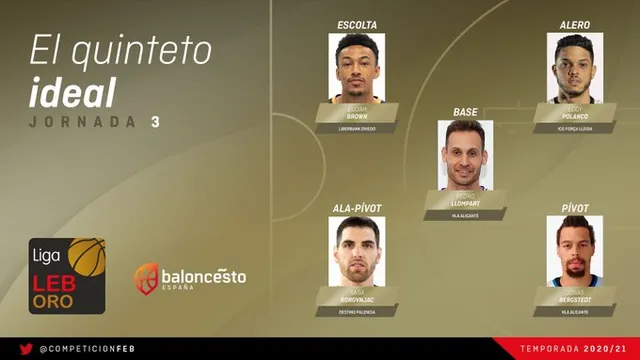 Escolta: Elijah Brown (Liberbank Oviedo) 26 val: 23 puntos (9/11 TL y 6/13 TC), 6 rebotes, 2 asistencias, 1 recuperación y 5 faltas recibidas.