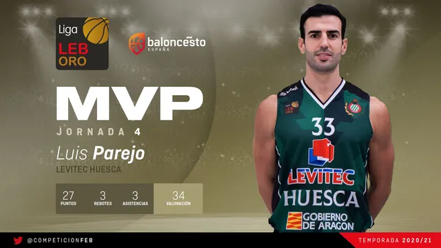 Escolta: Luis Parejo (Levitec Huesca) 34 val: 27 puntos (5/6 TL y 9/15 TC), 3 rebotes, 3 asistencias, 3 recuperaciones y 6 faltas recibidas.