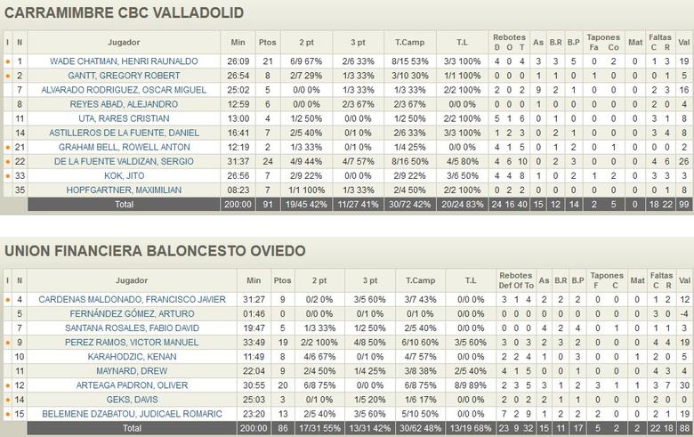 PUNTO DE INFLEXIÓN TRAS EL DESCANSO Tras tener una máxima ventaja de 28 puntos,llegó el comienzo de la segunda parte, y con ella, la esperada reacción de Oviedo. Victor Pérez y sus tres triples en el primer minuto de juego hicieron saltar todas las alarmas en el banquillo pucelano. Con un parcial de 0-14 parecía que los viejos fantasmas y las lagunas de concentración volvían a aparecer por Pisuerga, pero, en esta ocasión, apareció la templanza del base canario Oscar Alvarado, quién, y a pesar de no encontrarse completamente recuperado de la lesión en su mano izquierda, supo guiar de nuevo a los suyos y detener la sangría de puntos encajada.