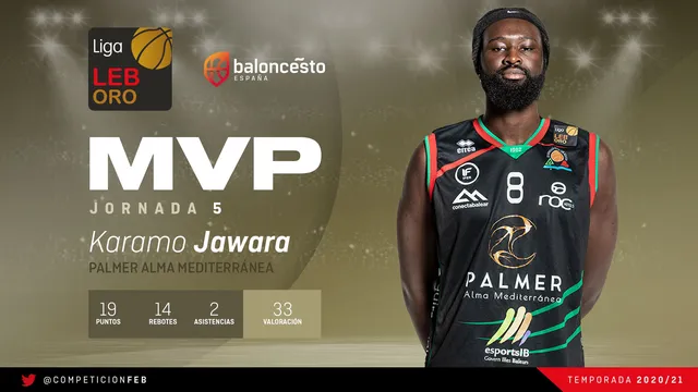 Ala-Pívot: Karamo Jawara (Palmer Alma Mediterránea) 33 val: 19 puntos (3/4 TL y 8/10 T2), 14 rebotes, 2 asistencias, 1 recuperación y 6 faltas recibidas.