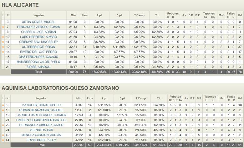El HLA Alicante se estrena con victoria en la liga tras doblegar a un Aquimisa Laboratorios Queso Zamorano que plantó cara durante todo el partido y que solo cedió en los últimos cinco minutos ante un equipo alicantino con mayor físico. La clave del triunfo local fue la superlativa actuación de Orion Outerbridge (34p, 6r). El jugador norteamericano percutía el aro desde todas las distancias y se mostraba imparable para la defensa zamorana. Xavi Hernández (10p) con sus triples y la actuación interior de Gervin (14p) e Iza (14p, 8r) mantuvieron a su equipo en partido hasta que en el tramo final los locales subieron un nivel su intensidad y acierto hasta romper el partido. La dirección del veterano Pedro Rivero (12p, 5r, 4a) servía a HLA Alicante para gestionar el tempo de partido y cerrar el primer triunfo de la temporada ante un Zamora que estuvo algo falto de equilibrio en su juego.