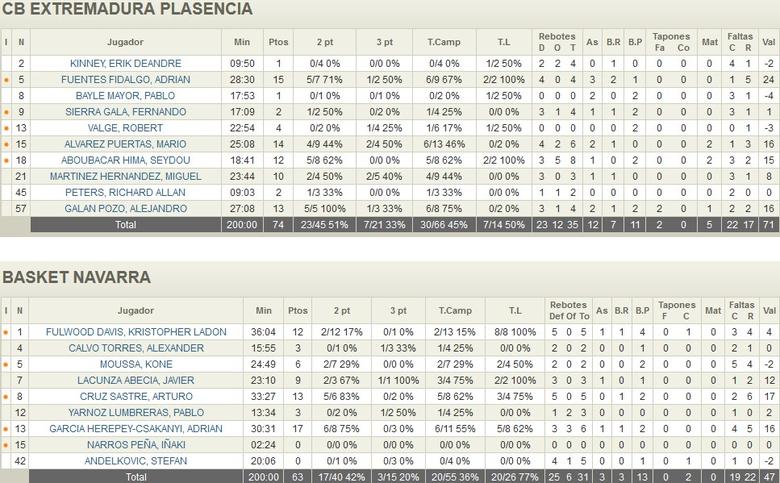 En el último cuarto, el base local Adrián Fuentes tomó los mandos del encuentro, llevando al equipo de Plasencia a mostrar su mejor versión y abrir una brecha en el marcador irrecuperable para los de Navarra que, con Arturo Cruz (13 p, 5r) y Adrian Garcia (17p ,6r) echaron el resto mientras el partido se consumía con la victoria de los placentinos, que tuvieron como jugadores destacados al ya mencionado Adrián Fuentes (15p, 4r) y a Mario Alvarez (14p, 6r). El resultado final fue 74-63.