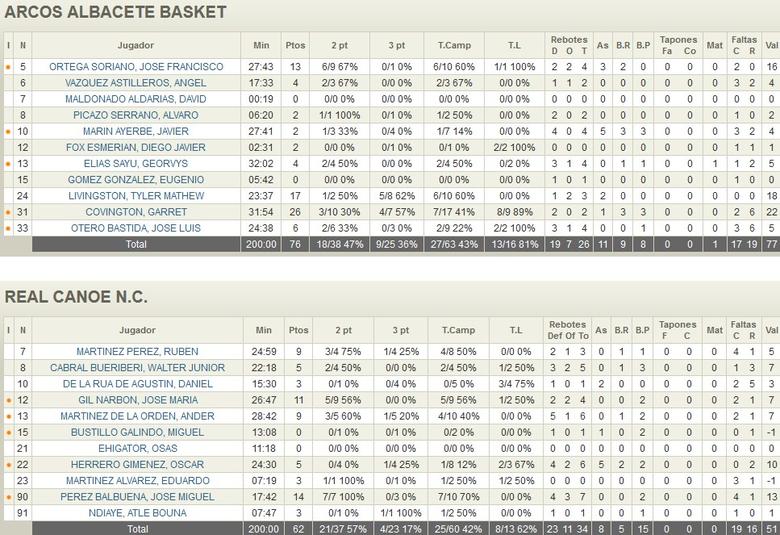 Una gran primera mitad de los locales sirvió para que el primer triunfo de la temporada se quedara en Albacete. El 42-20 del descanso fue una losa demasiado pesada para un Canoe que intentó remar y que mejoró prestaciones en la segunda mitad pero que nunca llegó a poder optar al triunfo final. El partido arrancaba con un 17-6 y con un Livingston (17p, 3r) muy acertado. En el segundo periodo emergía y se sumaba Garret Covington (26p) y consolidaba las rentas locales ante un Canoe que tuvo en Tyson Pérez (14p, 7r) y Óscar Herrero (5p, 6r, 5a) a sus hombres más destacados. Los madrileños llegaron a bajar de diez puntos la desventaja en el tramo final del tercer periodo pero de nuevo la pareja Covington-Livingston volvía a abrir hueco y sellaba el triunfo local.