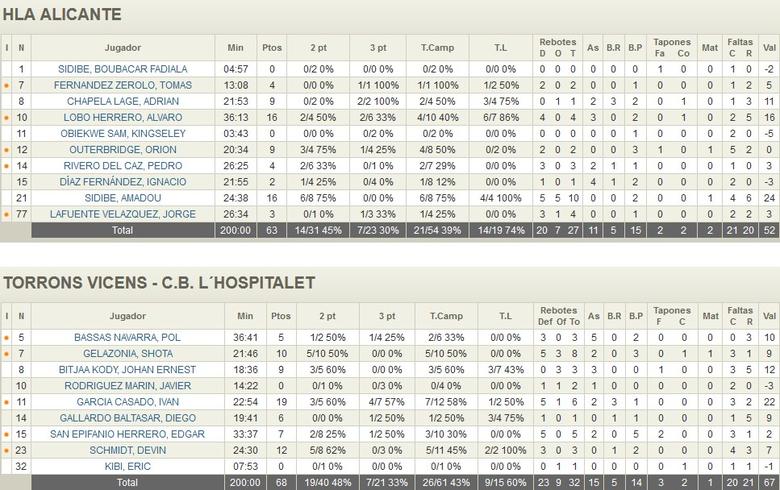 Segunda derrota en el Pedro Ferrándiz para un HLA Alicante que pierde la ocasión de igualar a los líderes y que sigue generando dudas en su juego. Un partido que dominó Hospitalet en muchas fases del encuentro pero que acabó decidiéndose en los instantes finales gracias a la mayor eficacia del conjunto catalán. HLA Alicante tuvo en la pareja Lobo (16p, 4r) – Amadou Sidibe (16p, 10r) a sus mejores argumentos en un equipo que tuvo a jugadores como Boubacar Sidibe o Nacho Díaz casi inéditos. Hospitalet funcionaba con el acierto ofensivo de Iván García (19p, 6r) el trabajo de Gelazonia (10p, 8r) cerca del aro y la eficacia de Schmidt en momento importantes. Al final tercer triunfo seguido para un Hospitalet que sigue consolidando su línea ascendente.