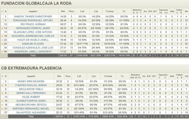 Plasencia luchaba con un Robert Valge (10 PT, 3 RT, 1 AS) enrachado en los minutos finales. Pero no fue suficiente. La Roda firmaba con comodidad una nueva victoria de +15 en el Lozano Jareño (87 a 72), con el equipo aplaudiendo a su afición entregada desde el medio de la cancha. A parte de la pizarra de Alejandro González, un joven entrenador de brillante futuro, un equipo unido que no deja de luchar y sabe sufrir en defensa, y el sexto hombre que es la afición del Lozano Jareño; La Roda envía un contundente mensaje desde su inexpugnable fortín para cualquier equipo en esta liga LEB Plata. El poderoso Covirán Granada y Pablo Pin también saben lo que es jugar y perder aquí. Cómo no, Placide Nakidjim, que ya se encuentra concentrado con su selección nacional del Chad, fue nuevamente el MVP del partido con 25 puntos en 28 minutos, 3 rebotes, 1 asistencia y 30 de valoración.