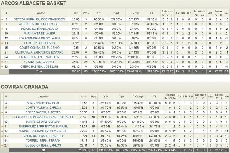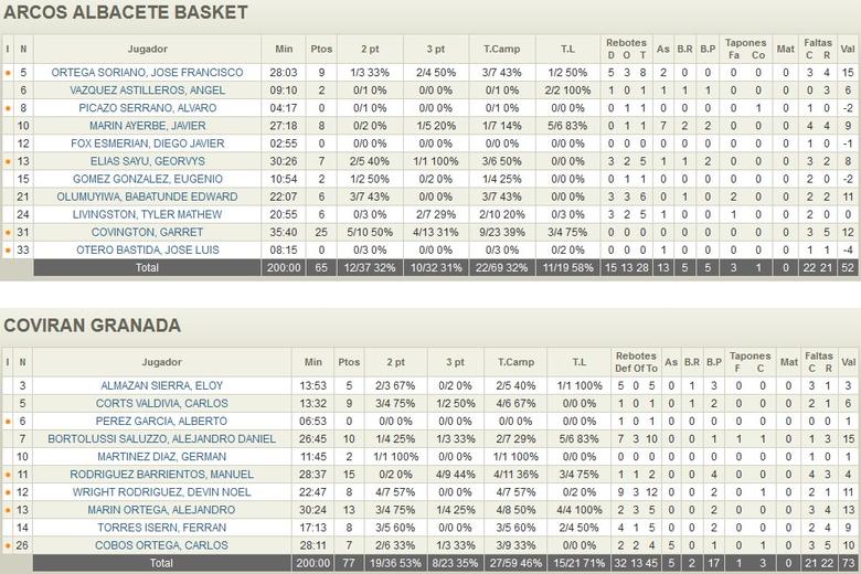 Arcos Albacete Basket se vio superado desde el primer cuarto 16 a 22, con todas las segundas opciones para el equipo de Covirán. Y fue incapaz de ganarle un solo cuarto (14/15, 18/20 y 17/20) a pesar de que lo intento de todas las formas y con un Garret Covington que se las tiró de todos los colores para firmar 25 puntos en 36 minutos de juego con un 4 de 13 en triples (31%).