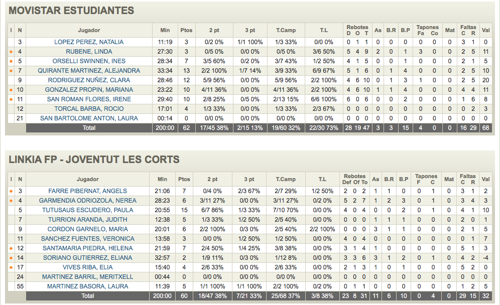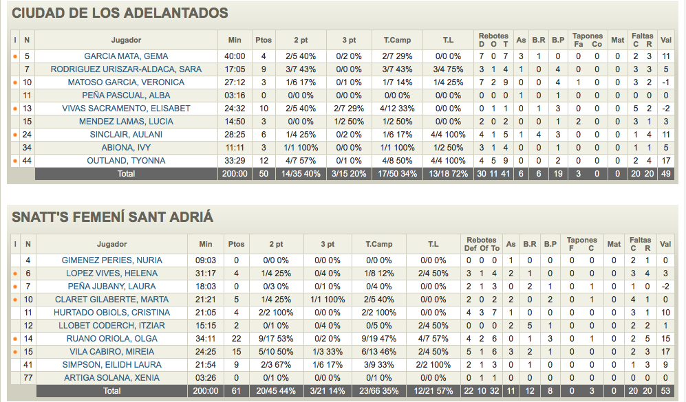 Adolfo González y su equipo estan on fire siguen en rancha, y ya suman 16 victorias seguidas, contando con el final de la temporada regular. Las de Sergio Manzano estan protagonizando una grata sorpresa dentro de la LF2, recordemos que son debutantes que se han clasificado para la fase de ascenso y estuvieron ganando gran parte del último cuarto, les costo entrar en el partido, pero la segunda mitad de las catalanas fue increíble, sin el premio de la victoria por culpa de una canasta sobre la bocina, después de rebote ofensivo de Mariana González. Las mejores del partido fueron Clara Rodríguez con 12 puntos y 10 rebotes (20 de valoración) y Paula Tutusaus con 15 puntos y 4 rebotes (10 de valoración).
