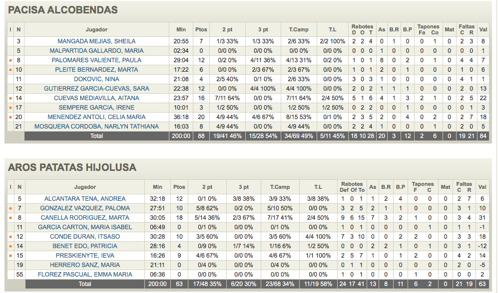 Las anfitriones sufrieron una dura derrota gracias al gran partido de Aitana Cuevas y Celia María Menéndez, que fueron una auténtica pesadilla para las de Isabel Fernández. La escuadra madrileña baso su triunfo en el gran parcial del segundo cuarto (32-16) y al descanso (46-28). Marta Canella fue la MVP sin premio sus 18 puntos, 15 rebotes y 7 asistensias se quedaron sin recompensa. Por su parte Patricia Benet tuvo un día olvidar se quedo en 4 puntos, pero con un 1/16 en tiros de campo para acabar con -12 de valoración.