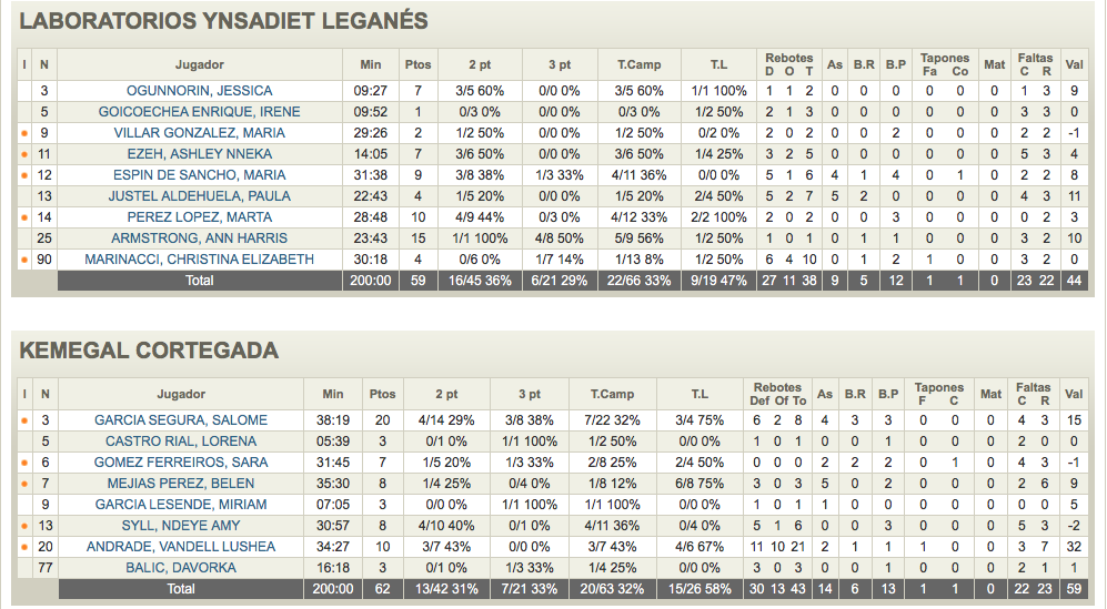 Sopresa con remontada, las jugadoras de Nacho García aún se estaran preguntando como han perdido un partido que parecían tener ganado y que las hubiera puesto a nada de clasificarse, pero esta derrota sopresiva dejo mucho abierto en el grupo 2. El parcial del último cuaro (13-20) fue determinante para la victoria de Cortegada. Salome García y Vandell Andrade fueron las heroínas de su equip, sobre todo la segundo que termina como MVP gracias a sus 10 puntos, 21 rebotes y 7 faltas recibidas para 32 de valoración, Salome por su parte se fue hasta los 20 puntos. En Leganés Ann Amstrong con 15 puntos fue la mejor
