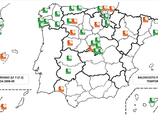 En el siguiente mapa se ve la ubicación de los equipos de Liga Femenina (naranja) y Liga Femenina 2 (verde):