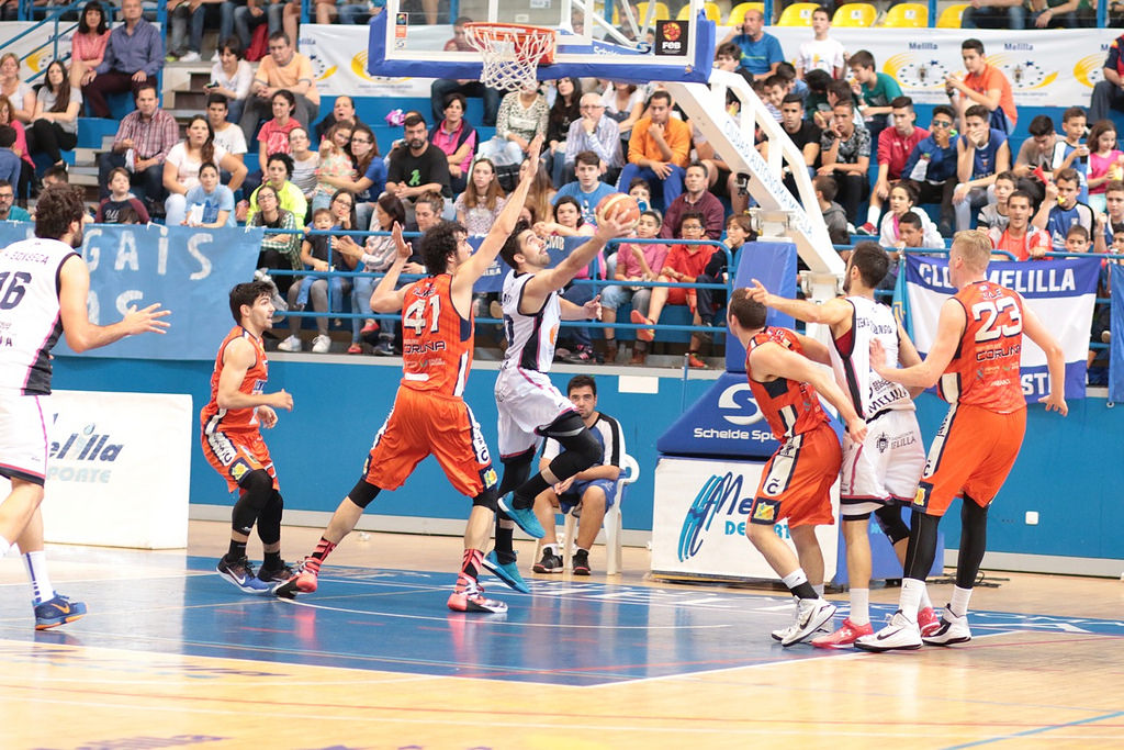 MEZCLA DE RITMOS Los dos primeros cuartos navegaron con el mismo ritmo que la eliminatoria. Altas puntuaciones, rápidas posesiones y una gran igualdad que se tradujo en que las diferencias no rebasasen los 5 puntos entre los dos equipos hasta mediado el segundo cuarto. Tras una antideportiva señalada al Leyma Básquet Coruña por una falta cometida a Josep Franch, el marcador reflejaba un 26-30 que metía el miedo en el cuerpo a los melillenses que llenaron el pabellón Javier Imbroda en la noche de este martes. Pero ese fue el punto de inflexión que marcó el renacer de los de Alejandro Alcoba merced a la buena dirección de Jorge Sanz y el trabajo de Edu Hernández-Sonseca, que en esta ocasión derrochó trabajo en ambos lados de la pista. Con el tiro de tres más afinado, los melillenses encararon el descanso con una renta de 12 puntos (46-34) que parecía definitiva.