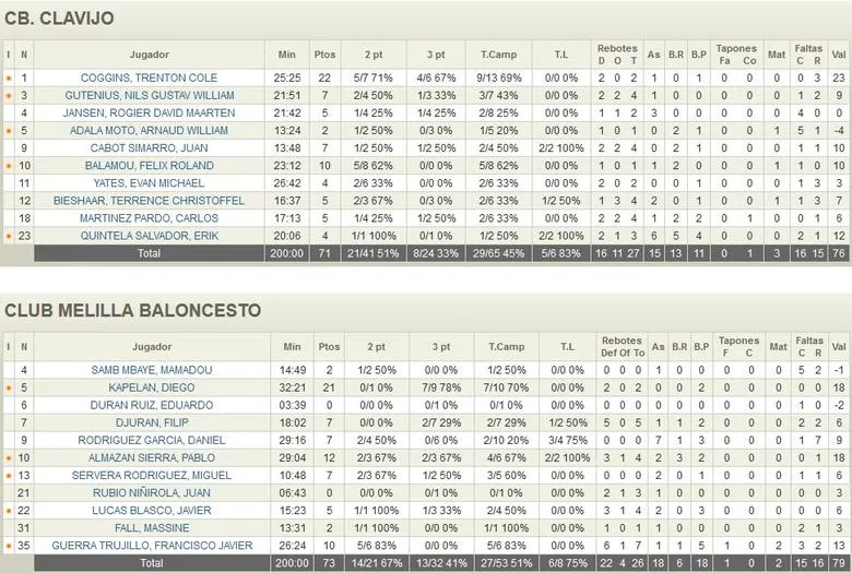 SEGUNDO CUARTO BIPOLAR CB Clavijo anotaba con facilidad en los primeros compases del segundo periodo y aumentaba la diferencia hasta los ocho puntos (26-18). A cinco minutos para el descanso Cabot cometía una antideportiva sobre Pablo Almazán que supuso un pequeño punto de inflexión en el encuentro para los melillenses, ya que aprovechaba para endosar un 0-8 de parcial y poner las tablas en el electrónico. Melilla Baloncesto cada vez se encontraba más cómodo, con unos excepcionales minutos de la conexión entre Dani Rodríguez y Fran Guerra. Aun así, los de Alejandro Alcoba no conseguían darle la vuelta al marcador y se marchaban al descanso dos puntos por debajo (39-37).
