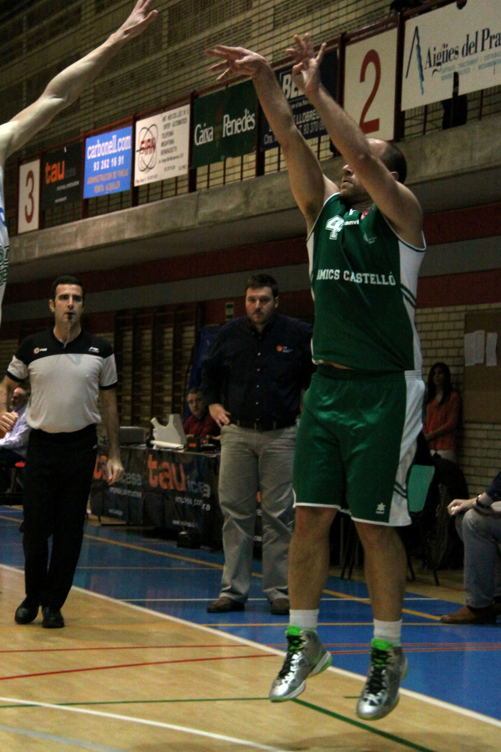 Con Parex incluso de inicio, el Amics Castelló comenzaba mostrándose con mucha solidez sobre todo en la pintura. Pese a las dos acciones de Todorovic, una de tres puntos, que ponían la ventaja local en 5-2, el dominio del marcador sería netamente verde a lo largo de todo el encuentro. Las torres gemelas visitantes, Hidalgo y Ortega, no encontraban apenas oposición para hacerse fuertes en la zona. Los locales comenzaron también a errar todo lo que convertían sus rivales en el otro aro. Y así se completó un parcial de 0-10 que rompió el marcador que mostraba un 9-21. Las rotaciones se sucedían en el cuadro local y pronto ya se ha cambió por completo el quinteto inicial ante la bisoñez en defensa en estático que permitió este despegue visitante. Frederic Castelló enlazó hasta tres triples que junto al de Ortega ayudó a consolidar la ventaja que al término de este primer periodo sería de 9 puntos, 15-24.