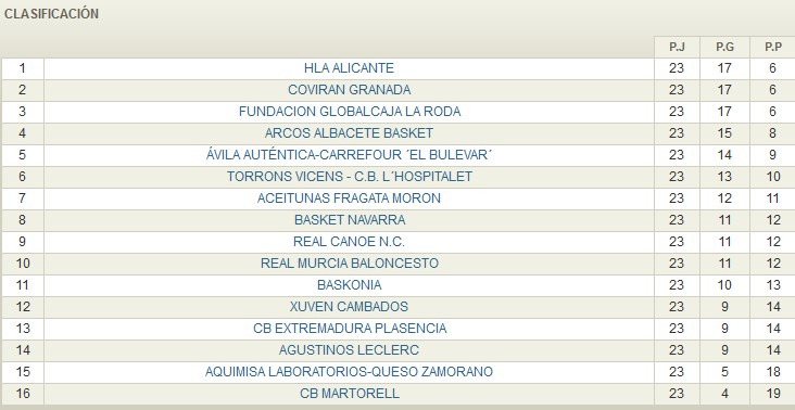 Tras el trío de cabeza sigue un Albacete Basket que no pierde de vista sus opciones de mirar hacia arriba tras su triunfo ante Zamora. Ávila y Hospitalet le siguen y preceden al grupo que luchará por las plazas de Playoff.