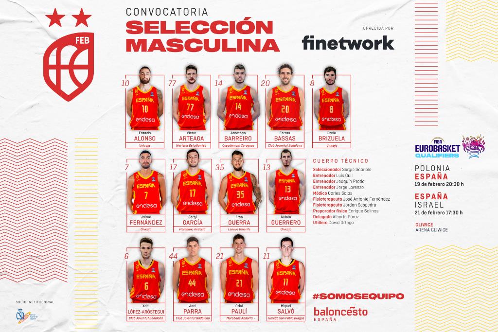Sin mucho apuro tras tener ya la clasificación en las manos, la Selección Española se medirá a Polonia el día 19 de febrero y el 21 del mismo mes a la selección de Israel, uno de los combinados que más hizo sufrir a “La Familia” durante la última ventana. En lo que se refiere a la convocatoria llama la atención el regreso de Jaime Fernández y las llamadas a Fran Guerra, Joel Parra y Miquel Salvó, jugadores que todavía no han debutado con el equipo absoluto.