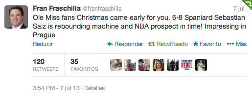 Ha causado tanto impacto en el reciente Mundial de la República Checa que incluso periodistas contrastados de USA presentes allí no tenían más que palabras de admiración ante la demostración de garra y poderío de nuestro representante español. El mismísimo Fran Fraschilla, ex entrenador de Universidades como New Mexico, Manhattan o Saint John's y ahora analista NCAA para la ESPN utilizaba las redes sociales desde la capital checa para dirigirse a los aficionados de Ole Miss felicitándoles por el gran jugador que se llevan: