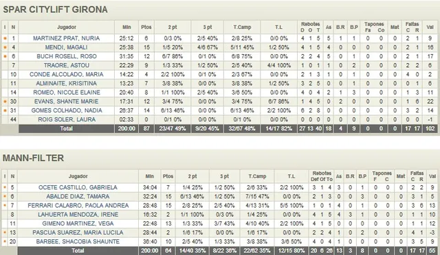 - Profundidad de banquillo. La rotación del equipo gerundense fue de 10 jugadoras y la del cuadro visitante de 7, con tres de ellas muy por encima de los 30 minutos de juego. Si al cansancio acumulado en las piernas del Mann-Filter le sumamos el hecho de tener una plantilla corta, a las de Víctor Lapeña no les queda otra que tirar de corazón y aprovecharse del apoyo de su afición para tratar de forzar el desempate.