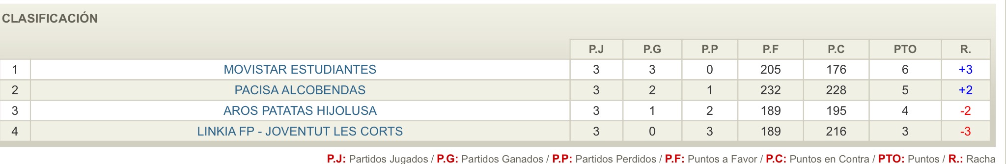 | Movistar Estudiantes | Linkia FP-Joventut Les Corts | Pacisa Alcobendas | Movistar Estudiantes | Pacisa Alcobendas |