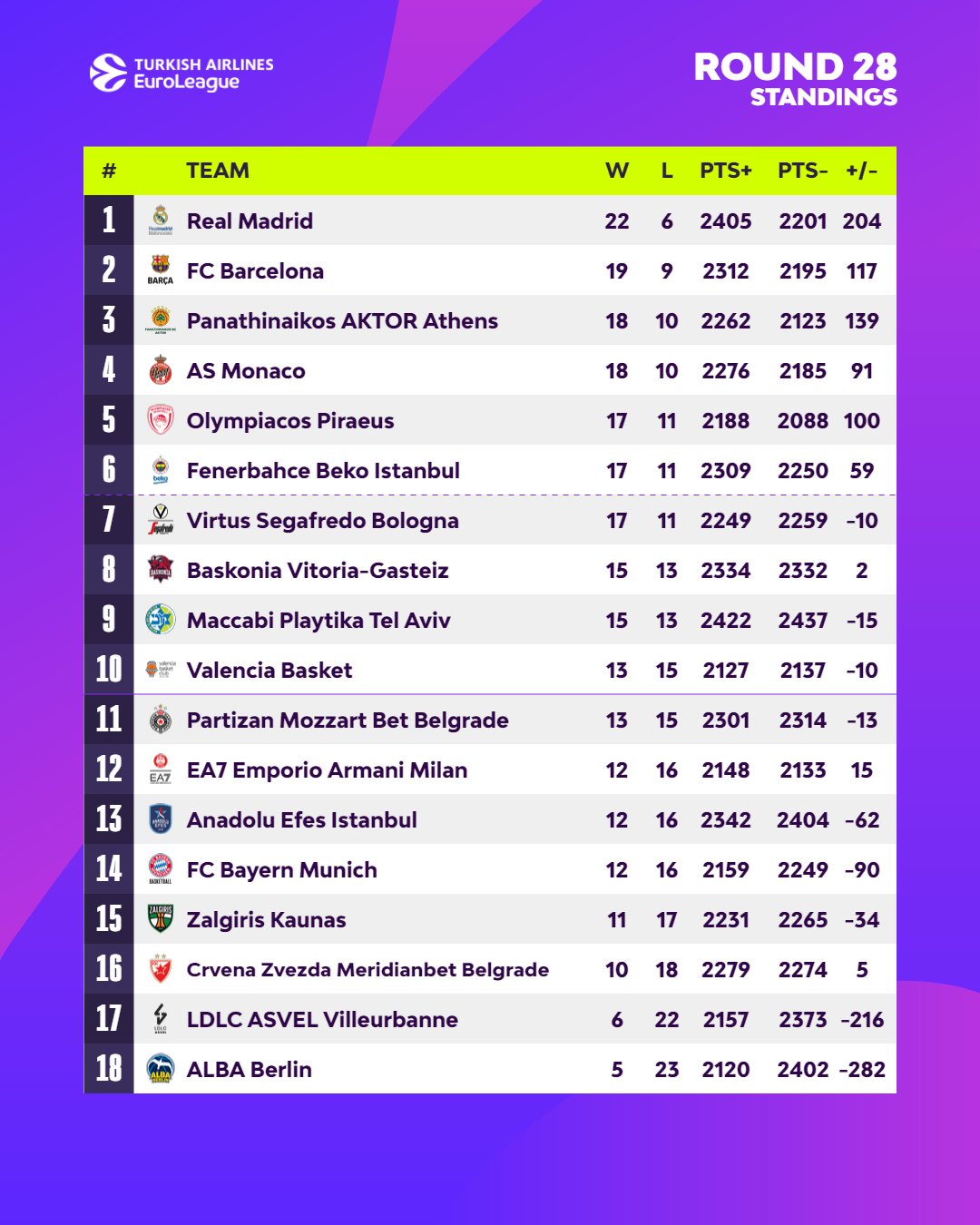 Real Madrid (22-6) y FC Barcelona (19-9) siguen líderes destacados. Tras ellos, Panathinaikos (18-10), que con una gran segunda parte de temporada es tercero por delante de AS Mónaco (18-10) y Olympiakos (17-11).
