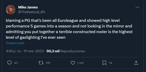 “Echando la culpa a un base que ha sido de lo mejor de la Euroliga y ha mostrado un gran rendimiento en cinco partidos esta temporada sin mirarse a sí mismo al espejo y sin reconocer que ha construido una horrible plantilla es el caso más claro de luz de gas que he visto en mi vida”, así de claro ha sido en este tuit Mike James para defender la actuación de Pangos en este comienzo de temporada y sobre todo, para críticar a Messina y pedirle que tenga un poco más de autocrítica para reconocer que es el gran culpable del mal momento de Emporio Armani Milan.