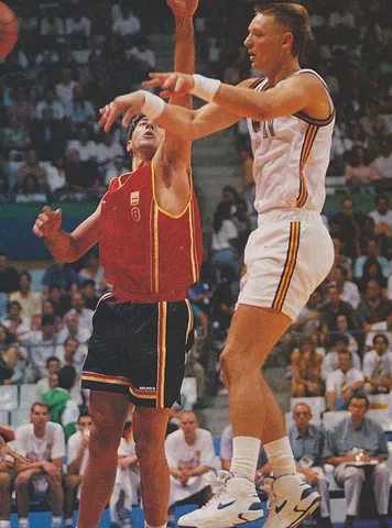 Nuestro hombre más alto era Santi Aldama, un poco experimentado 2.13 que hizo buenos partidos en la preparación y además había realizado una buena temporada. Orenga y Andreu, con sus poco más de 2.05, eran los que intenban proteger la pintura. Muy duros y luchadores pero imitados de talento y atleticismo. Durante los Juegos, Andrés Jiménez tendría que competir de forma perpetua desde el 4 y la opción de un alero grande y reboteador que equilibrara tales deficiencias se esfumó con el descarte de un veterano Fernando Arcega y la autoexclusión de Cargol lo que acentuó más nuestra debilidad en la pintura. Y todo en un escenario hipercompetitivo. Todas las estrellas NBA y Europeas quisieron participar. La Alemania de Detlef Schrempf, que con 2.07 podía jugar en las 5 posiciones aunque en la selección germana combinaba el 1 y el 2, mostró nuestras miserias. 83-72 para los germanos y 20 rebotes para Hansi Gnad, un hercúleo jugador que pasó con más pena que gloria por la NBA y el Real Madrid.
