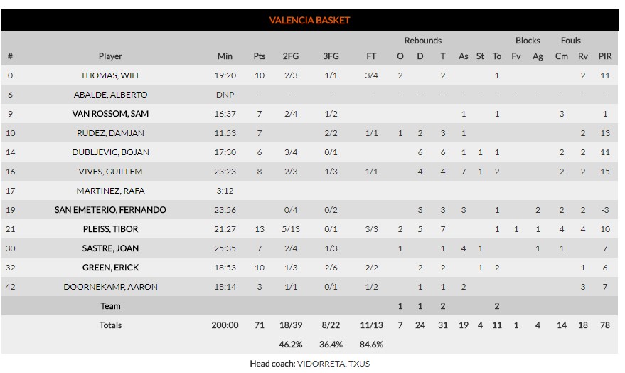 2 Huérfano de Green: como si las rotaciones le confundieran, el escolta que tiene a media Euroliga deslumbrando hacía hoy 10 puntos, aunque casi todos de ellos cuando ya estaba todo el pescado vendido y se desgranaban los minutos de la intrascendencia. Su salida del quinteto titular, quizás en la búsqueda de mejores pares defensivos a los que atacar, hacía inoperante para el partido de hoy al escolta, mientras que Dubljevic, también desde la banca, comparecía tarde e intermitente al partido. Así y ante las piernas y el músculo blaugrana, el título al máximo encestador taronja recaería sobre el alemán Pleiss, sin que ningún otro compañero pudiera recoger los testigos de lo de anotar.