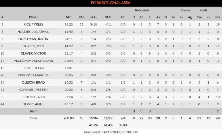 Pero Bartzokas pedía otro tiempo muerto; y el gran líder de la nave azulgrana esta noche, Tyrese Rice, completaba la remontada con otro triplazo suyo, encabezando una serie de jugadas en las que sus compañeros anotaban de tres en tres: ¡66-68 a falta de 46 segundos! Con el partido más en contra, Efes era capaz, sin embargo, de anotar un dos más uno de la mano de Dunston, empatando el encuentro. El pívot falló el adicional, pero un compañero palmeó y la canasta valió dos puntos. El resultado era de 70-68 a falta de 3 segundos, y la victoria se hacía imposible para los culés, a pesar de la remontada y del partidazo de Rice (22 puntos y 7 asistencias). Finalmente, el marcador indicaba un 72-68.