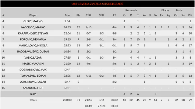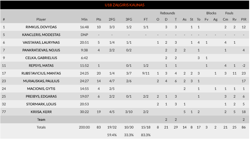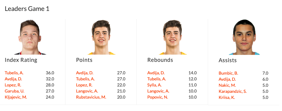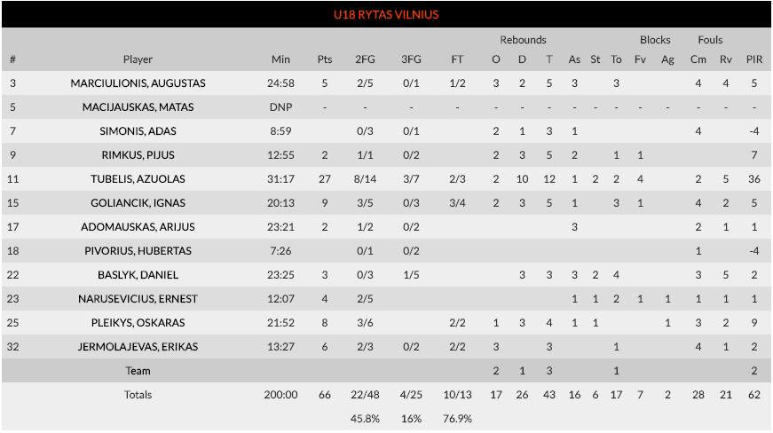 Finalizando la primera jornada, el Crvena Zvezda se impuso al Rytas Vilnius de principio a fin. Hasta 4 jugadores superaron la barrera de los diez puntos, pero sin duda la extraordinaria actuación de Azuolas Tubelis con 27 puntos y 12 rebotes para el +37 de valoración, fue el plato principal del encuentro.