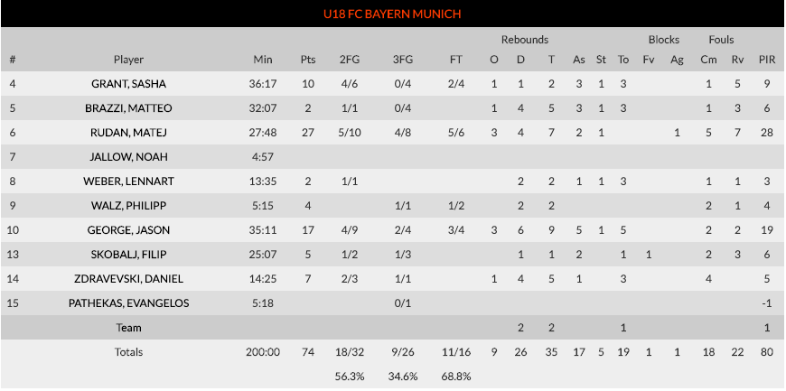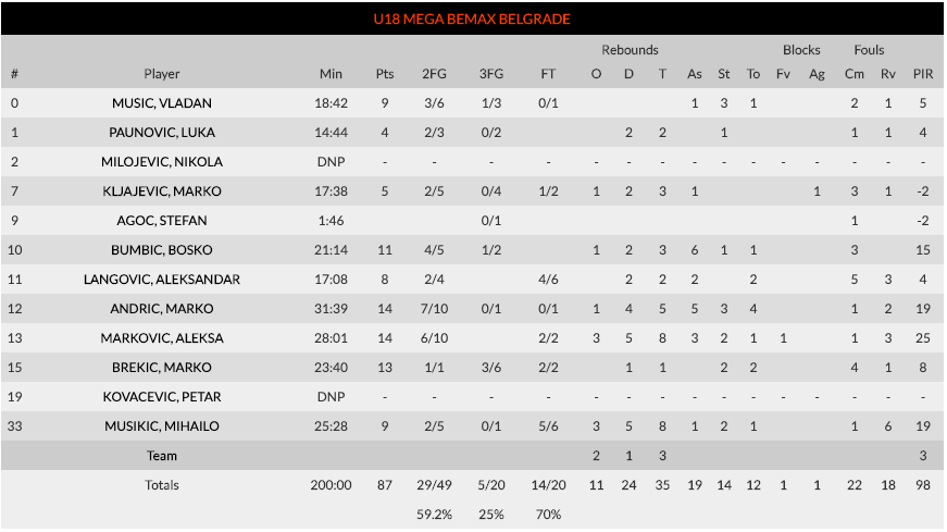 Desde las 9:00 pudimos ver en el polideportivo de Mendizorrotza un duelo entre los dos invictos del grupo A. El Mega Bemax se impuso con el resultado 87-74 gracias a las increíbles apariciones de jugadores como Mihailo Musikic (9 puntos y 8 rebotes) o Marko Andric (15 puntos, 5 rebotes y 5 asistencias). Dejando atrás a estos dos fantásticos jugadores, el claro referente del equipo serbio está siendo Aleksa Markovic que una vez más ha sido el más valorado de su equipo con un +25 de valoración gracias a sus 14 puntos y 8 rebotes. Matej Rudan (+28) fue el referente del equipo alemán y MVP del partido (está promediando 17 puntos y 4.5 rebotes durante la competición).