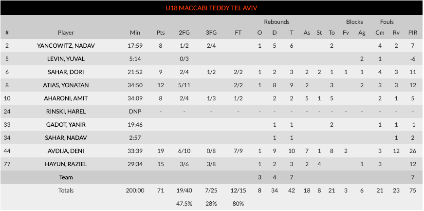 En el segundo encuentro de la jornada, Maccabi realizó una de las mayores remontadas de la historia del ANGT. Tras ir todo el partido a contracorriente del Zalgiris Kaunas, llegando a estar hasta 14 puntos abajo, Deni Avdija (casi triple-doble con 19 puntos, 10 rebotes y 7 asistencias) se echó el equipo a la espalda en la segunda parte y con dos tiros libres puso a su equipo por delante en los últimos segundos. En la última posesión de los lituanos, realizó un tapón que le permitió firmar la primera victoria de su equipo en la competición.