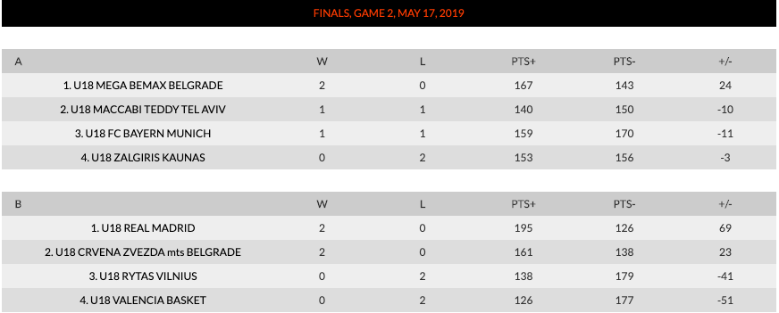 | GRUPO A MEGA BEMAX BELGRADE 87-74 FC BAYERN MUNICH ZALGIRIS KAUNAS 70-71 MACCABI TEDDY TEL AVIV |