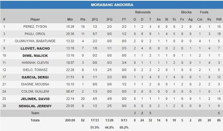 En la primera parte jugaron los doce jugadores de MoraBanc Andorra. El que menos jugó fue Guillem Colom con 5:17 y solo Sergi García y Oriol Paulí superaron la decena con poco más de once cada uno. Sin duda esto era clave para evitar el cansancio que podía tener la plantilla por culpa del parón y de los efectos del Covid19 y le funcionó perfectamente a Ibon Navarro, ya que solo Dime se quedó sin anotar en esos primeros veinte minutos, en los que los del principado disfrutaron de una aportación muy repartida de todos sus jugadores. En la segunda parte se mantuvieron dichas rotaciones y solo cinco jugadores superaron por poco la veintena en minutos, sin llegar ninguno a 23. Con estos datos no resulta raro el dato de los 39 puntos que sumaron los jugadores de banquillo.