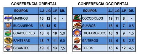 Clasificación. Gigantes de Guayana sumó su sexta victoria de la temporada, quedando con un balance de 6-13 que no le sirve aún para abandonar el puesto de colista de la Conferencia Oriental. En la misma situación se encuentra Toros de Aragua, que sigue en la cola de la Conferencia Occidental con un balance de 6 triunfos y 12 derrotas.