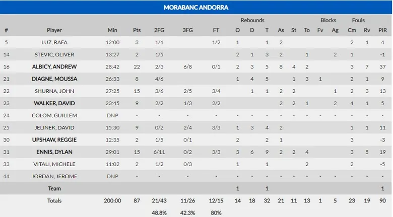 Otros anotadores. Aunque el hecho de que Albicy ganara su duelo particular con Cobbs fue clave para la victoria, más importante fue aún que el base francés tuviera más acompañamiento durante la mayor parte del partido. Dylan Ennis al principio, Shurna durante todo el partido y Jelinek en momentos puntuales fueron los acompañantes que provocaron que Andorra llevara el mando en el marcador durante todo el tiempo de juego. Los momentos en los que Cedevita se acercó fueron también gracias a las rachas de Elgin Cook, Jacob Pullen y Edo Muric, que fueron los que consiguieron el empate a 81.