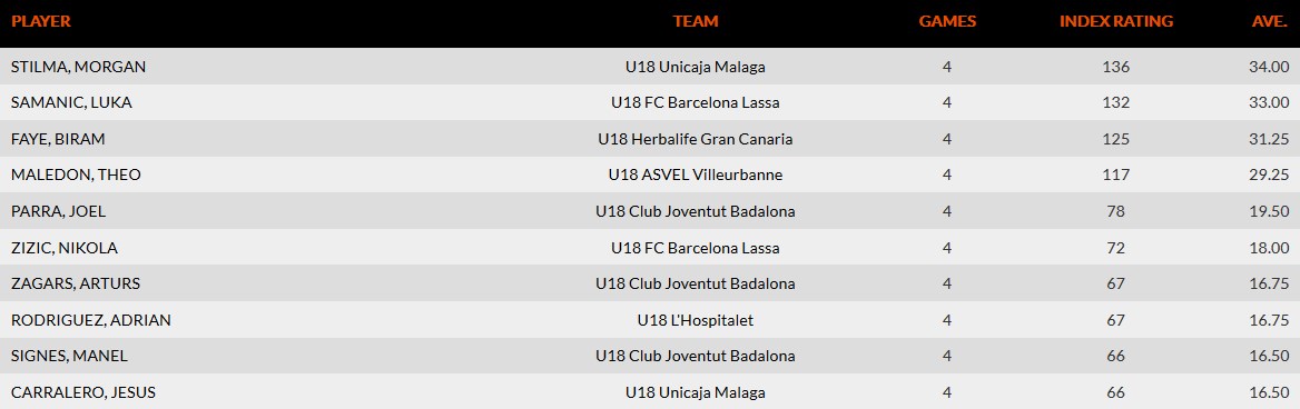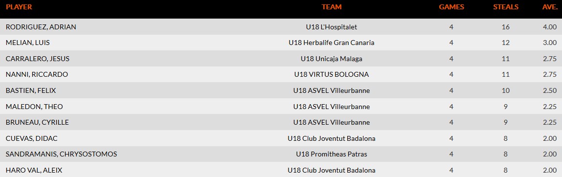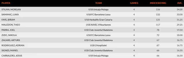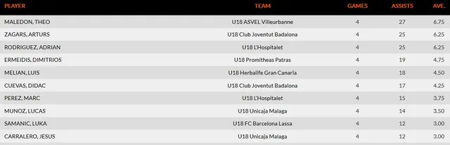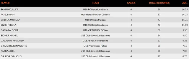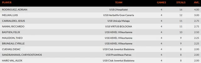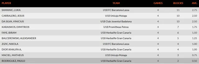Una vez más encontramos a Samanic liderando uno de los rankings de la competición. Sus 2.08 de altura y su facilidad para poder defender en 1 contra 1 a jugadores más bajos, le permite taponar con bastante frecuencia a sus rivales. Destacar la aportación de Jesús Carralero y Vinicius Da Silva es necesaria ya que su presencia en defensa durante el torneo se ve reflejada en este tipo de estadísticas. Ojo a este último, midiendo 2.12 m de altura y siendo del 2001 puede ser uno de los referentes del Joventut junior la próxima temporada.
