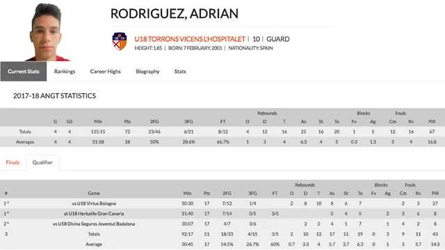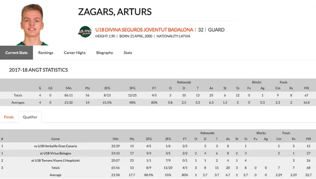 Siendo del 2001 y obteniendo la 7ª posición en el campeonato ha conseguido estar dentro de muchos de los mejores jugadores de la competición. En la primera jornada realizó su mejor partido marchándose hasta los 27 de valoración gracias a sus 17 puntos, 10 rebotes y 8 asistencias.