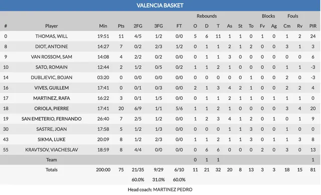 El club de los sospechosos habituales. Una vez más y como ya lo fueran contra el Retabet Bilbao Basket, Antoine Diot y Will Thomas fueron claves para que el Valencia Basket lograse una victoria más en Europa que sumada a la derrota del Hapoel Jerusalén en Krasnodar certifica de forma oficial la primera posición del equipo taronja en su grupo de Eurocup. El francés anotaría los cuatro puntos finales del equipo valenciano mientras que Thomas acabaría con dobles figuras 11 puntos y 11 rebotes para un total de 24 de valoración siendo el más valorado del equipo. Destacar también la actuación de Pierre Oriola, el catalán lograría anotar 20 puntos, el másimo anotador de los taronja para un total de 20 de valoración.