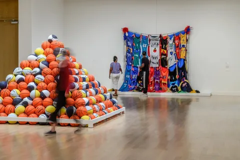 Otra de las obras que se pudo contemplar fue una instalación titulada ‘Heavy Heavy‘, dando forma a cada bola de hormigón, pesando cada ella 30 libras. Quiere simbolizar ese proceso físico de los sueños no realizados, simbolizan cada forma. “A menudo, la negrura, en términos deportivos, particularmente en Canadá, se borra. La gente no piensa realmente en los jugadores de baloncesto canadienses negros. Pero mi hermano creció pensando que iba a ser un jugador de la NBA“.