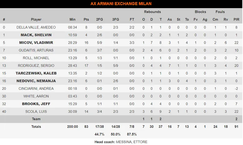 La victoria se queda en Milán, por 83-70, gracias a una eficacia espectacular (14/27) desde el perímetro de los de Ettore Messina. Todo fueron malas noticias para el FC Barcelona después de ver el peor partido en ataque de Nikola Mirotic con la zamarra blaugrana (13 puntos, 5 rebotes) y la lesión de Brandon Davies, de la que aún no se sabe el alcance. De esta manera, los transalpinos igualan a los de Pesic en la clasificación, con cinco victorias y una derrota, haciendo perder el invicto a su rival de hoy.
