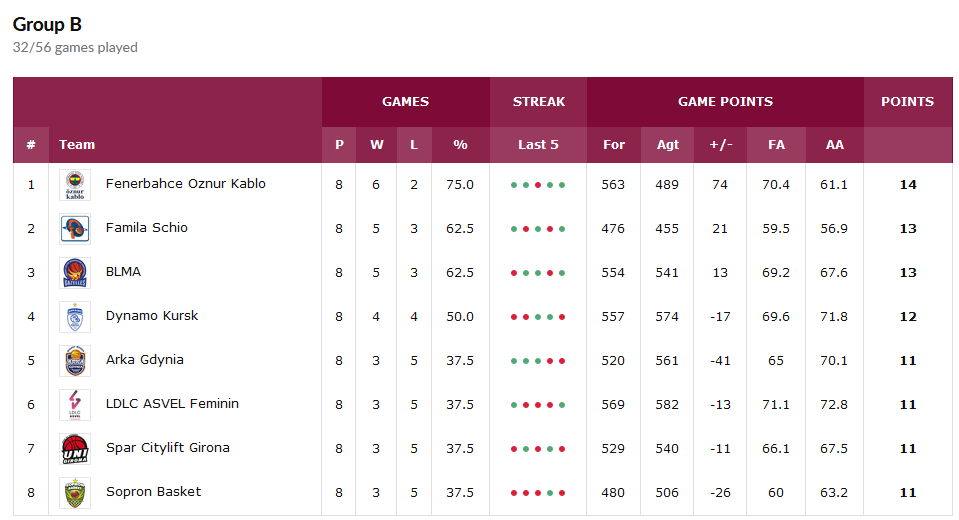 La Euroliga femenina tiene un formato de liga regular dividido en dos grupos. El único equipo español que compite este año lo hace en el grupo B, donde Girona ocupa la penúltima plaza, al contar con 3 victorias y 5 derrotas. La última, ante Fenerbahce este jueves por 57-62 ante el que es el líder del grupo.