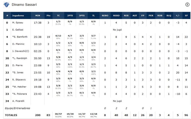 - Scott Bamforth. El ex ACB ha sido el líder del equipo italiano con sus 19 puntos, 9 rebotes y 5 asistencias. El de Albuquerque apareció sobre todo en el último y definitivo cuarto, cuando los «jugones» no se esconden, donde anotó 10 puntos.