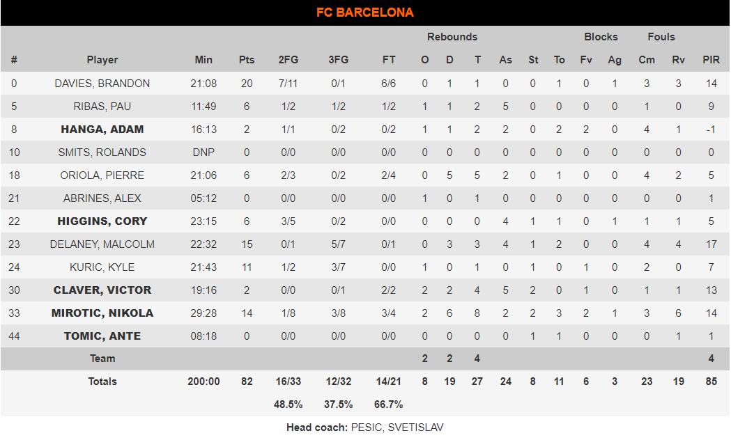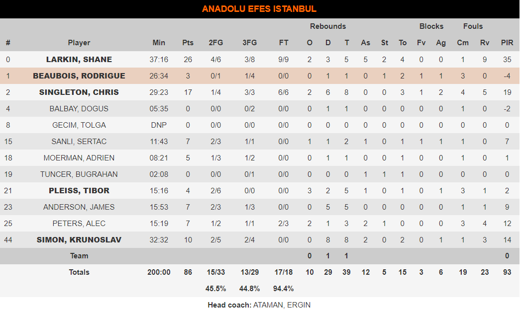 La baja de Micic y Larkindependencia: La sorprendente baja del máximo asistente del conjunto turco, por problemas en el tobillo en el último entrenamiento, dejó a Shane Larkin solo ante el peligro. Y no se amilanó. A un comienzo que rayó la perfección le siguió una dependencia en ataque asombrosa. El partido lo dirigía él para los turcos y fue el mejor del partido con 26 puntos, 5 rebotes, 5 asistencias y 2 robos.