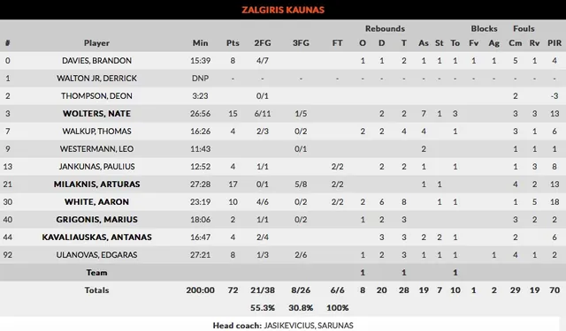 Gran juego coral lituano: pese al abuso del bote en muchos momentos del partido, los bases de Zalgiris Kaunas lograron encontrar con brillantez a sus compañeros sumando 17 asistencias entre todo el equipo. Un juego muy combinativo, consiguiendo llevar el balón hasta el hombre desmarcado en cada jugada.