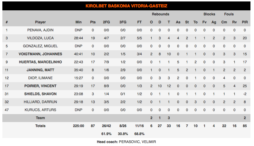 2. Poirier-Vildoza. Poirier fue el hombre roca del encuentro. Sumando, reboteando y conectando muy bien tanto con Huertas como con Vildoza. Acabó fuera a tres minutos del final del partido por faltas, pero fueron fundamentales 17 puntos, 12 rebotes y 25 de valoración para el Baskonia tras la ausencia de Shengelia. Asimismo, Vildoza asumió los galones en el último cuarto, dos triples vitales para que los vascos tuvieran practicamente la victoria en sus manos. 19 puntos, 4 rebotes, 4 asistencias y 20 de valoración para el base argentino.