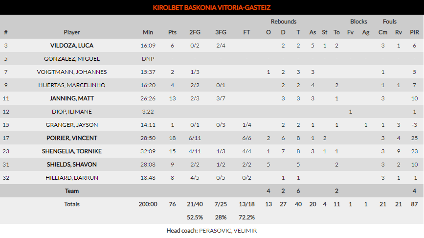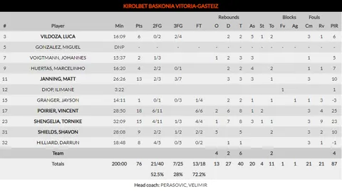 El último cuarto siguió la misma constante y Higgins (17 puntos) y Peters (20 puntos) se echaron el equipo a la espalda, pero el carácter y el coraje de Kirolbet Baskonia en general y del dúo Shengelia-Poirier en particular pudieron con el todopoderoso CSKA y finalmente los vascos se alzaron con una victoria agónica (76-73).